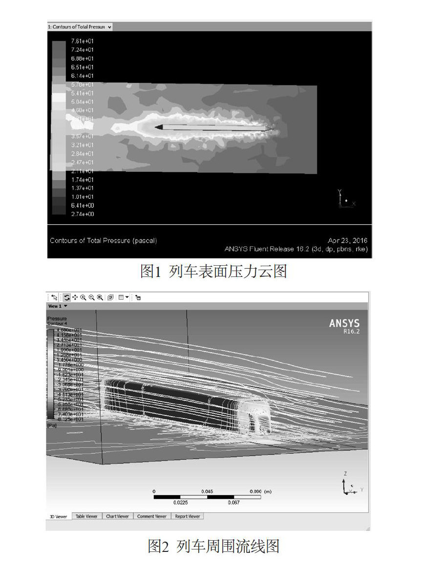 本文利用ANSYS16.2模拟了湍流系统[7]。将真实数据与湍流模拟数据进行比对,表明来风速度与小型风洞风速一致,为约10 m/s,两者符合良好,证明了本文工作的准确性。通过数值模拟同时可获得列车表面压力云图和列车周围流线图,分别如图1和图2所示。